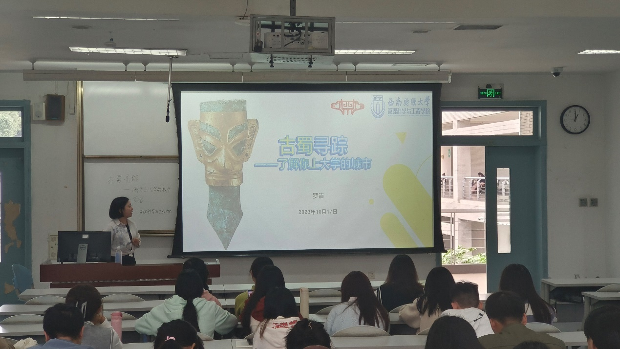 10月17日,管理科学与工程学院在经世楼F201举办“古蜀寻踪——了解你上大学的城市”文化素质讲座,主讲人为中国博物馆协会会员、四川博物院志愿者委员会委员罗洁,辅导员徐淼主持讲座,来自管理科学与工程学院、计算机与人工智能学院、 人文与艺术学院的70余名同学参加了本次讲座。