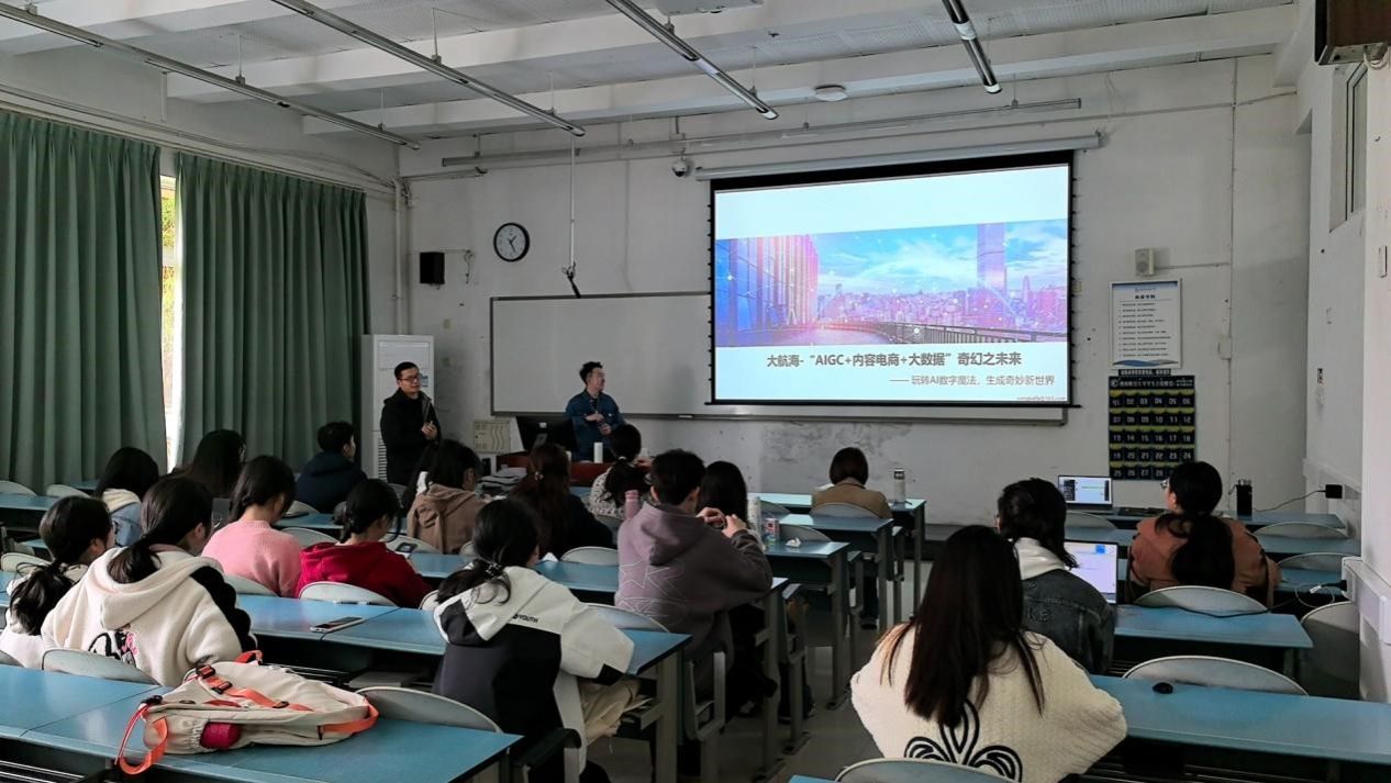 特邀主讲人宋开发是聚焦于人工智能领域的简叁智能科技公司创始人,曾经联合发起的成都数联铭品大数据公司,获得了上亿元的投资。宋开发向在场的师生们深入浅出地介绍了AIGC的最新发展现状,以及生成式AI技术在电子商务领域的创新应用与前沿探索。