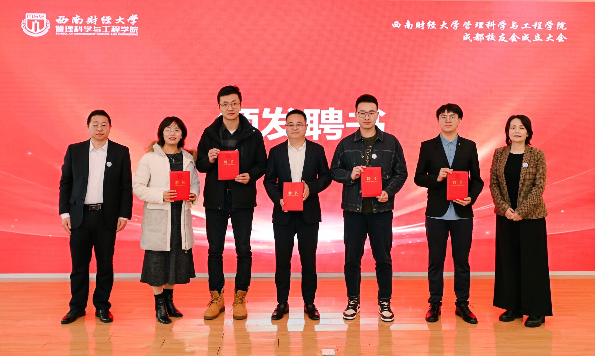 副院长王宇宣读管理科学与工程学院成都校友会第一届机构成员名单,学院党委书记周敏和院长鲁万波为机构成员颁发聘书。