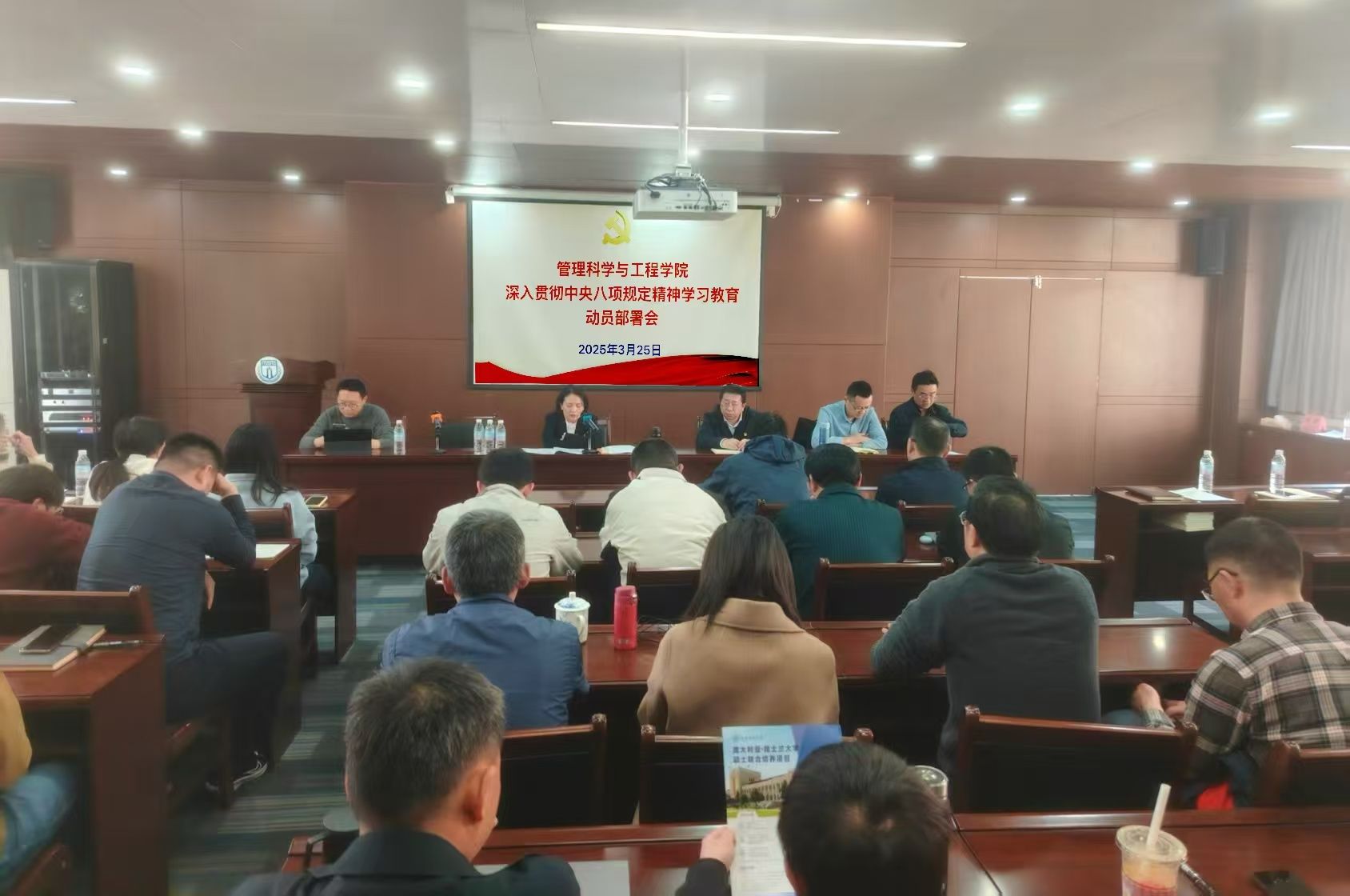 3月25日下午,管理科学与工程学院在柳林校区通博楼D301室召开党委(扩大)会议,传达学校深入贯彻中央八项规定精神学习教育工作部署会议精神,对学院深入贯彻中央八项规定精神学习教育进行动员部署。学院党委书记周敏主持会议并讲话,学院领导班子成员、两委委员、师生党支部书记和全体党员教师参加会议。