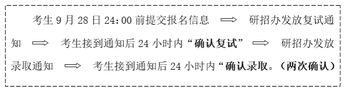4.获得拟录取资格的申请人务必于9月28日(预计)24:00前登陆教育部“全国推荐优秀应届本科毕业生免试攻读研究生信息公开暨管理服务系统”填写并提交报名信息。并按照如下程序完成录取确认,逾期未确认将视为自动放弃录取资格(申请人填报的志愿信息必须与拟录取专业(方向)一致,直博生应单独勾选直博项目)。